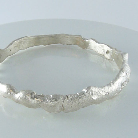 Unique hand forged, solid sterling silver bangle with the organic textures of volcanic lava rock and a particularly irregular edge