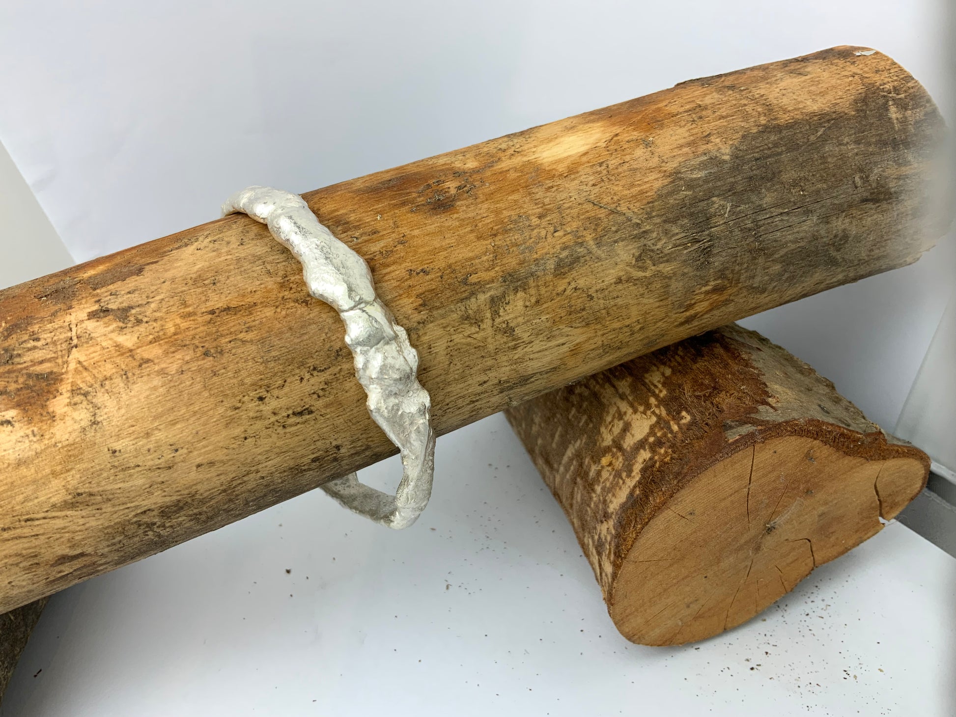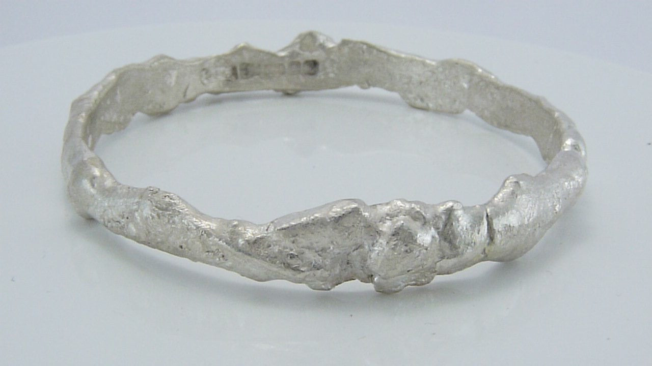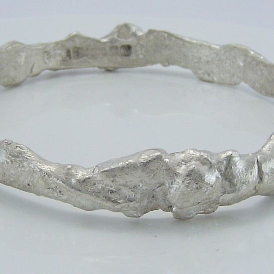 A solid sterling silver bangle, forged by hand, creating the irregular texture of a raw silver nugget