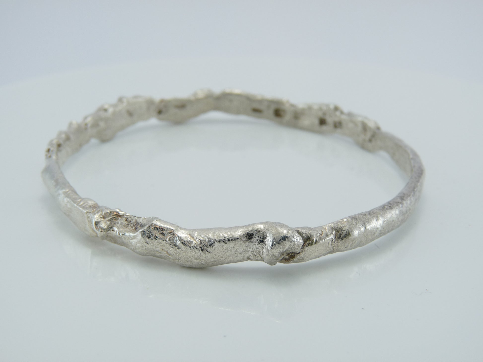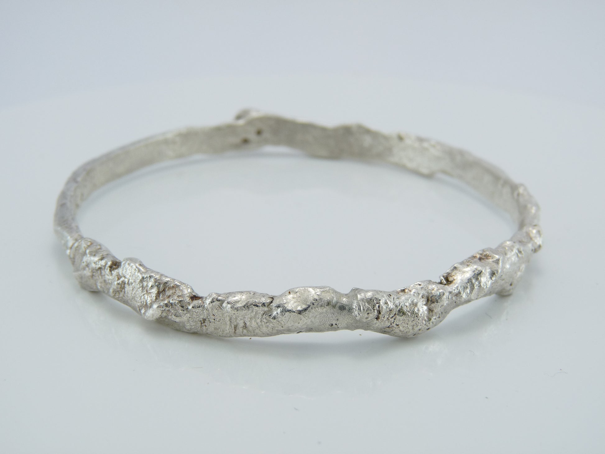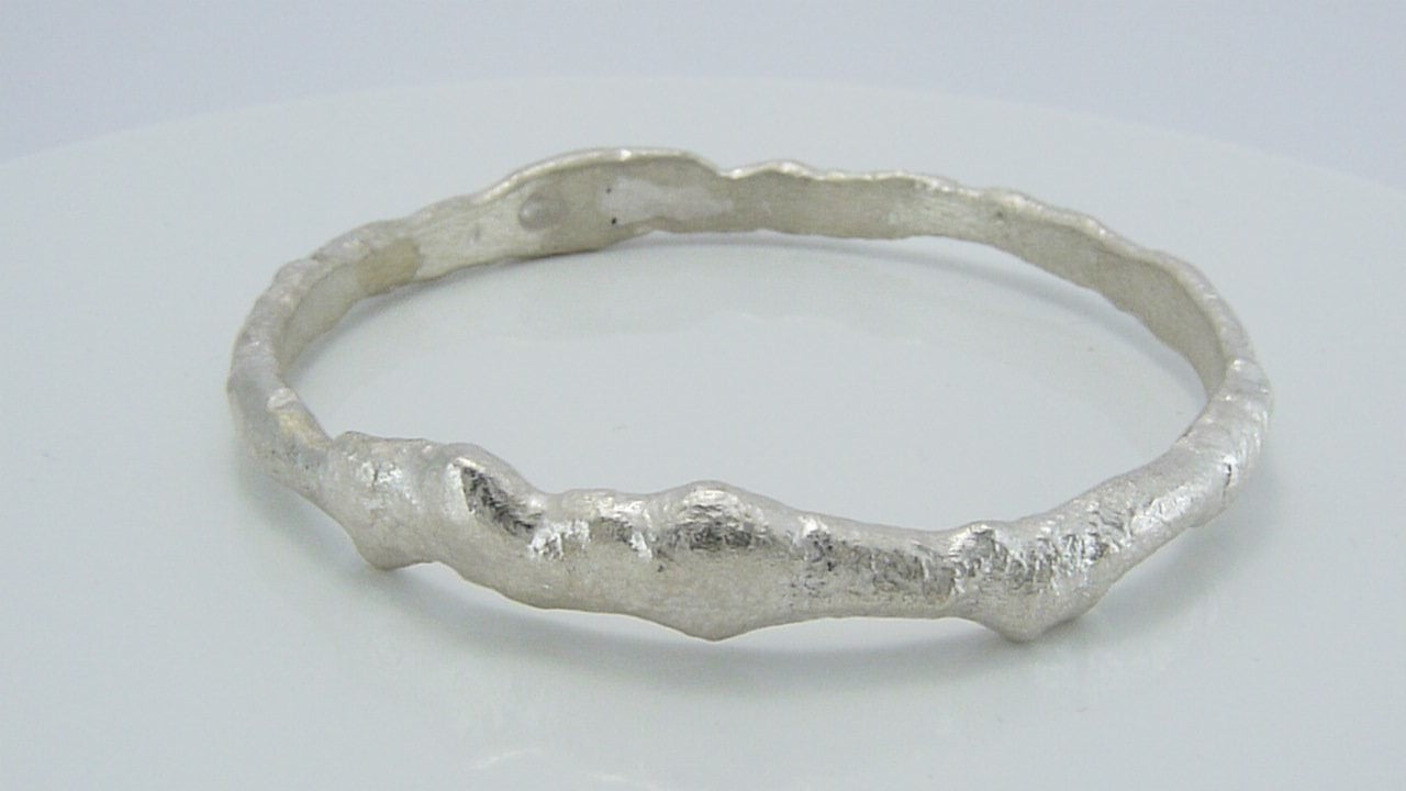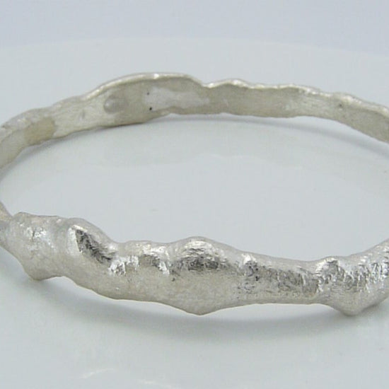 Solid sterling silver bangle, forged by hand, forming molten silver into an organic lava like texture