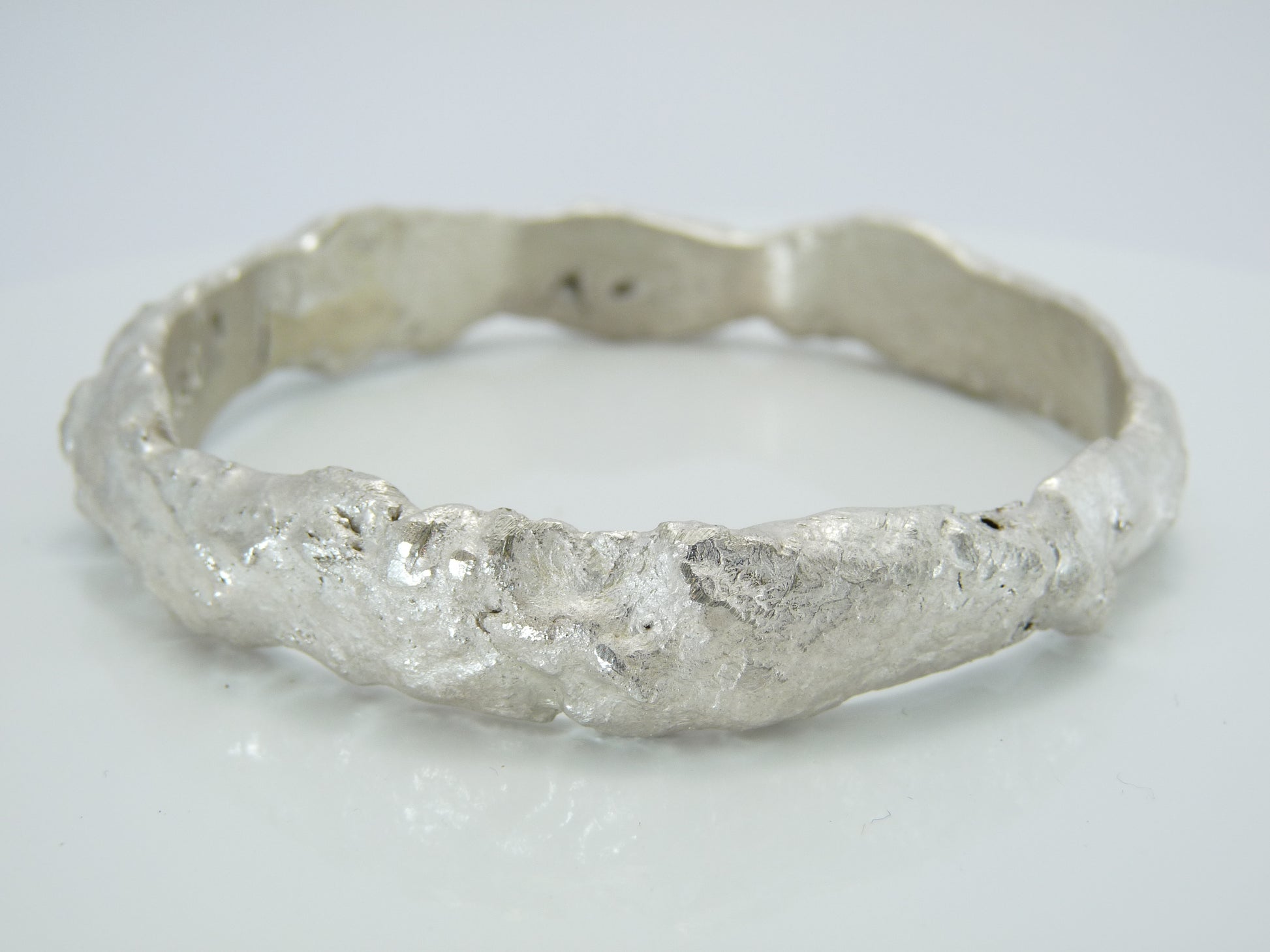 Heavy, solid sterling silver bangle, forged by hand, forming molten silver into irregular nugget like texture