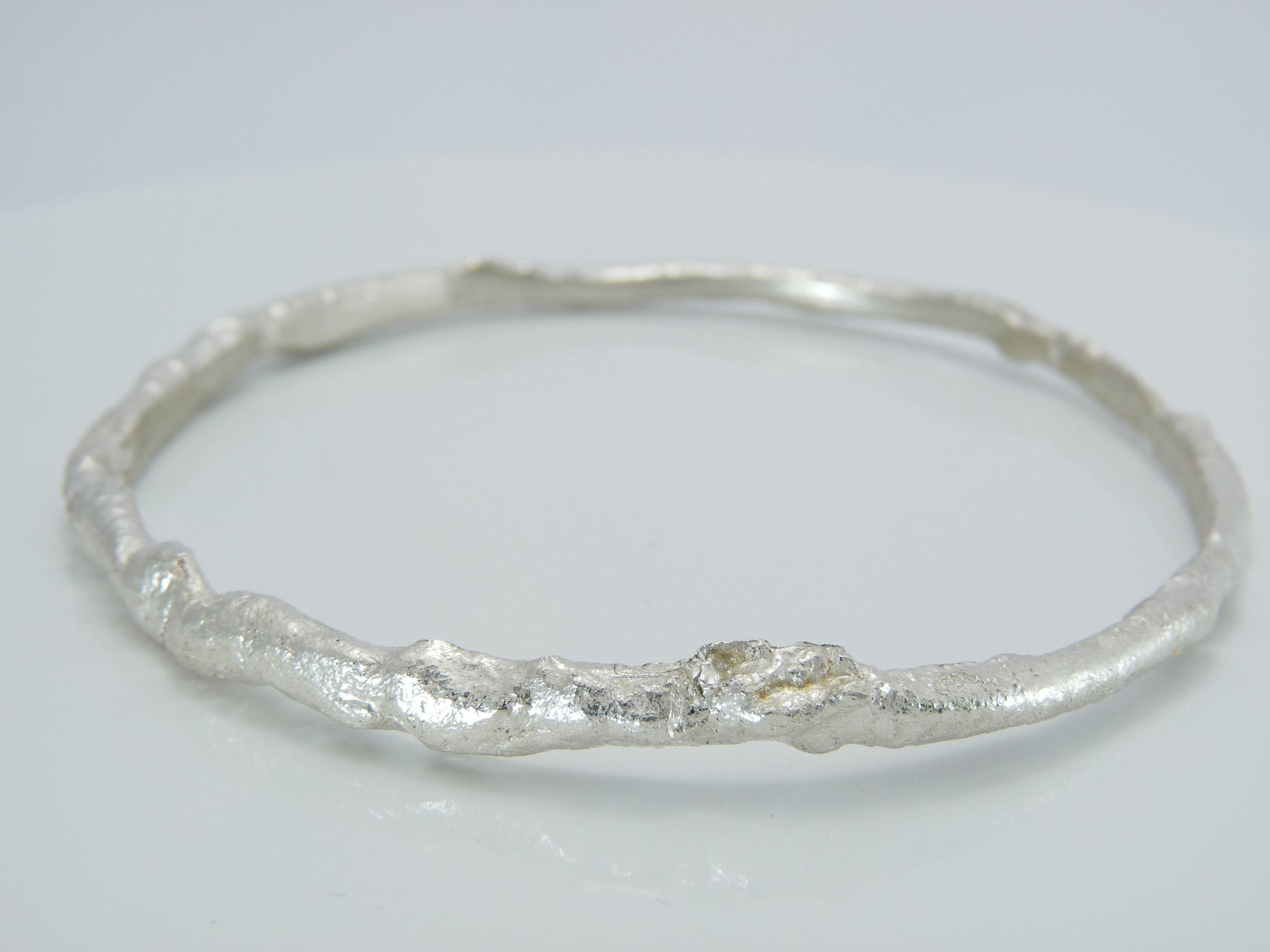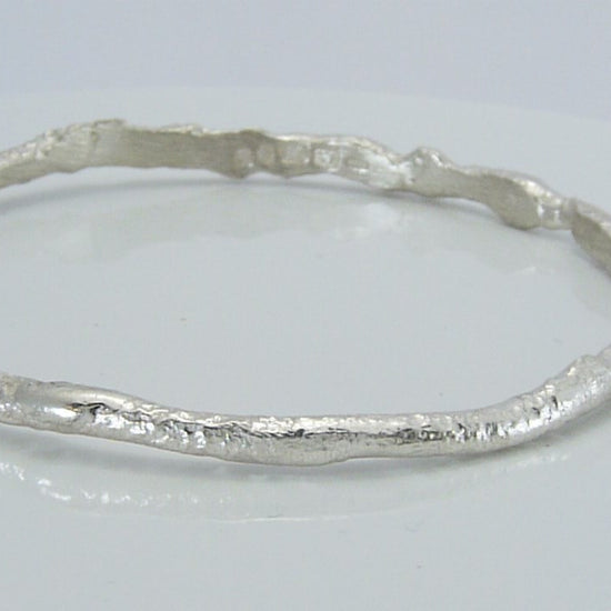 Solid sterling silver bangle, forged by hand, forming molten silver into a lighter weight, organic lava like texture