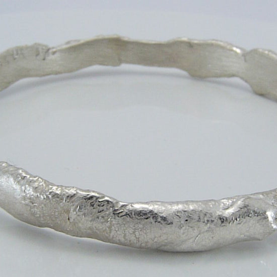 Solid silver art bangle. Hand made from molten silver formed into the irregular and undulating textures of organic rock