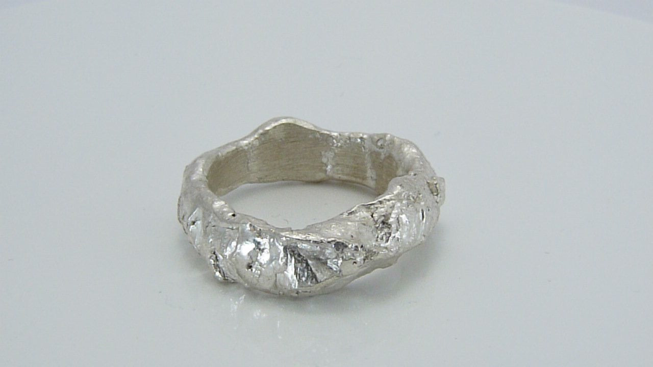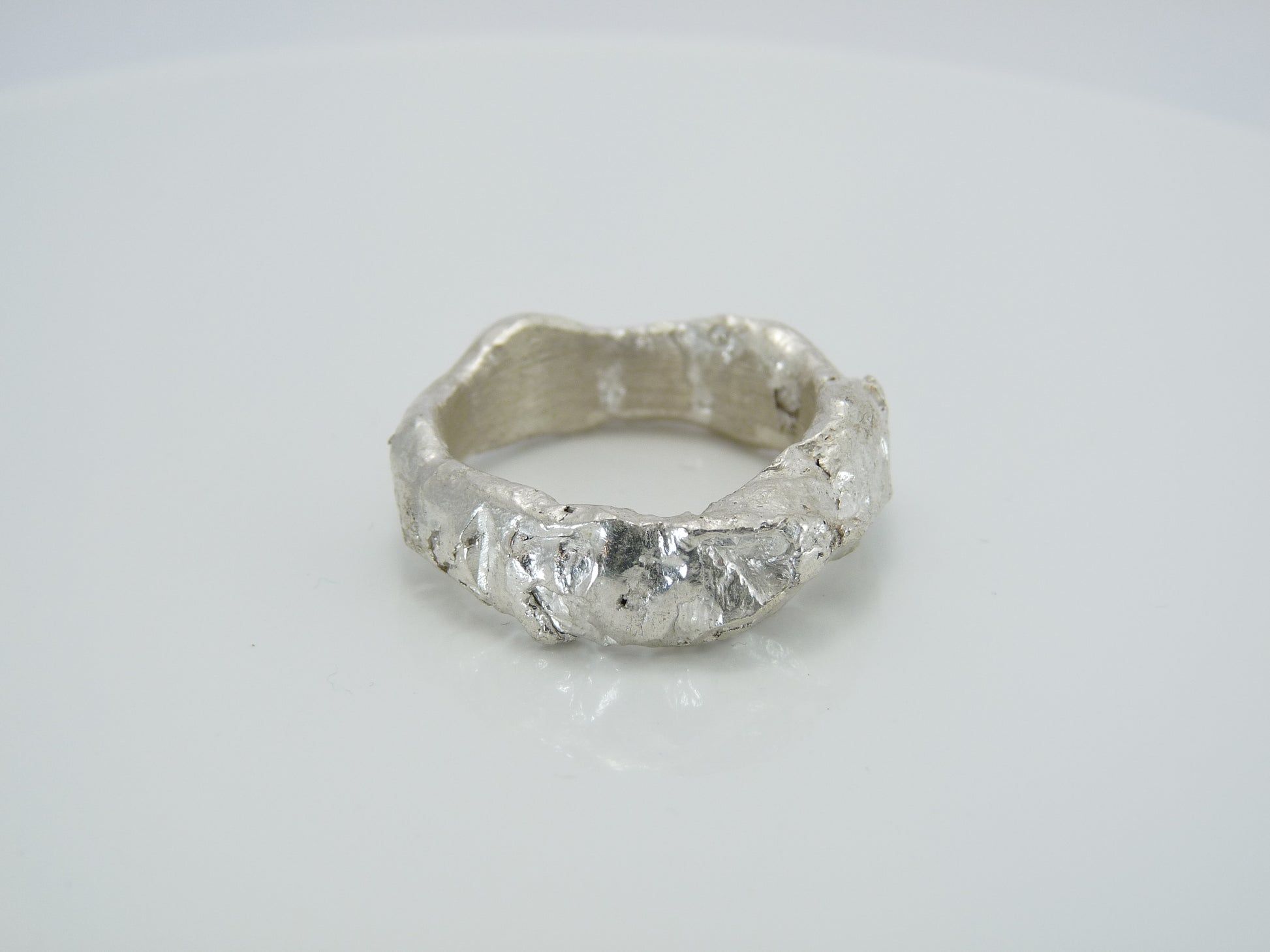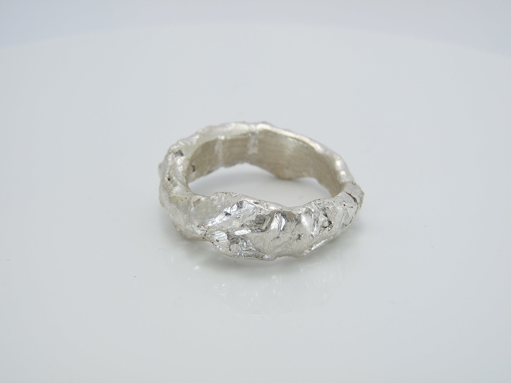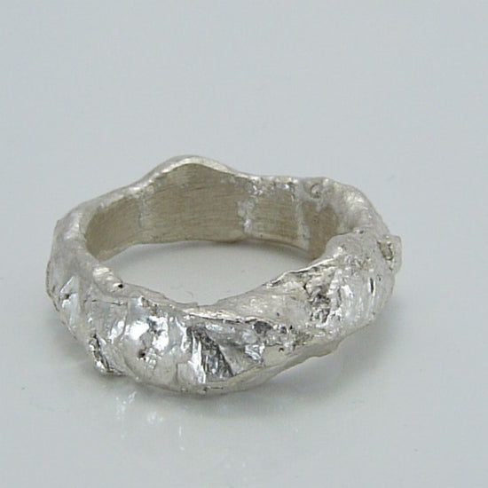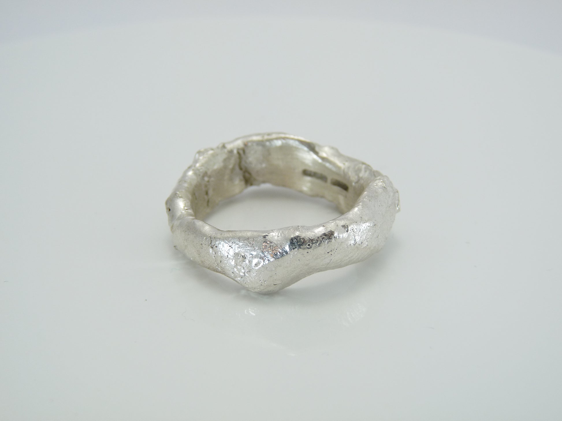 A solid sterling silver ring, hand forged allowing the molten silver to flow into the textures of volcanic lava like rock