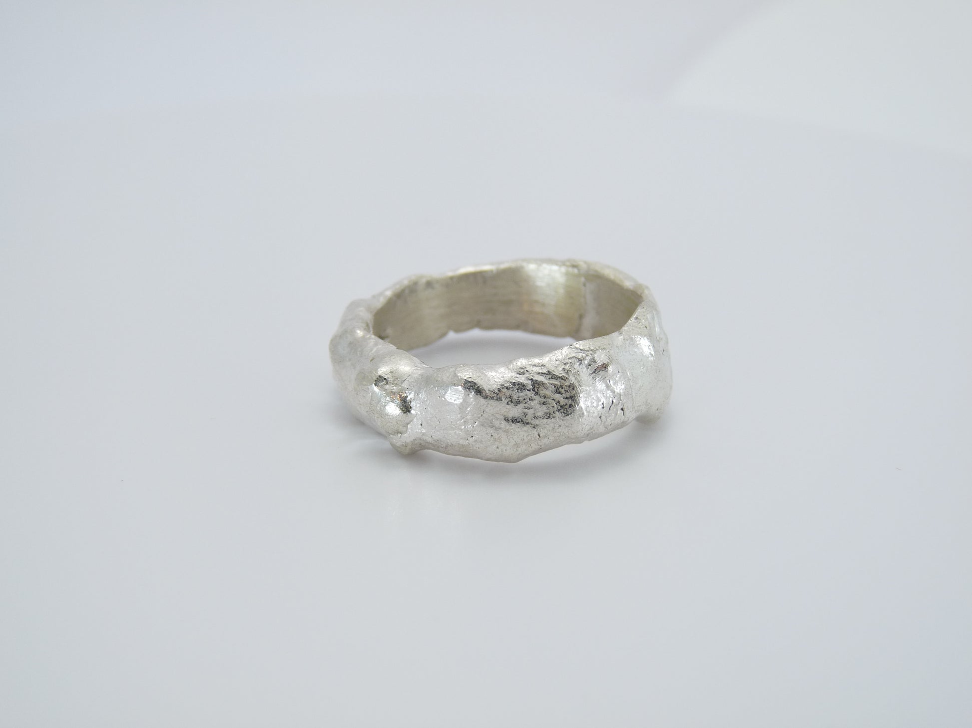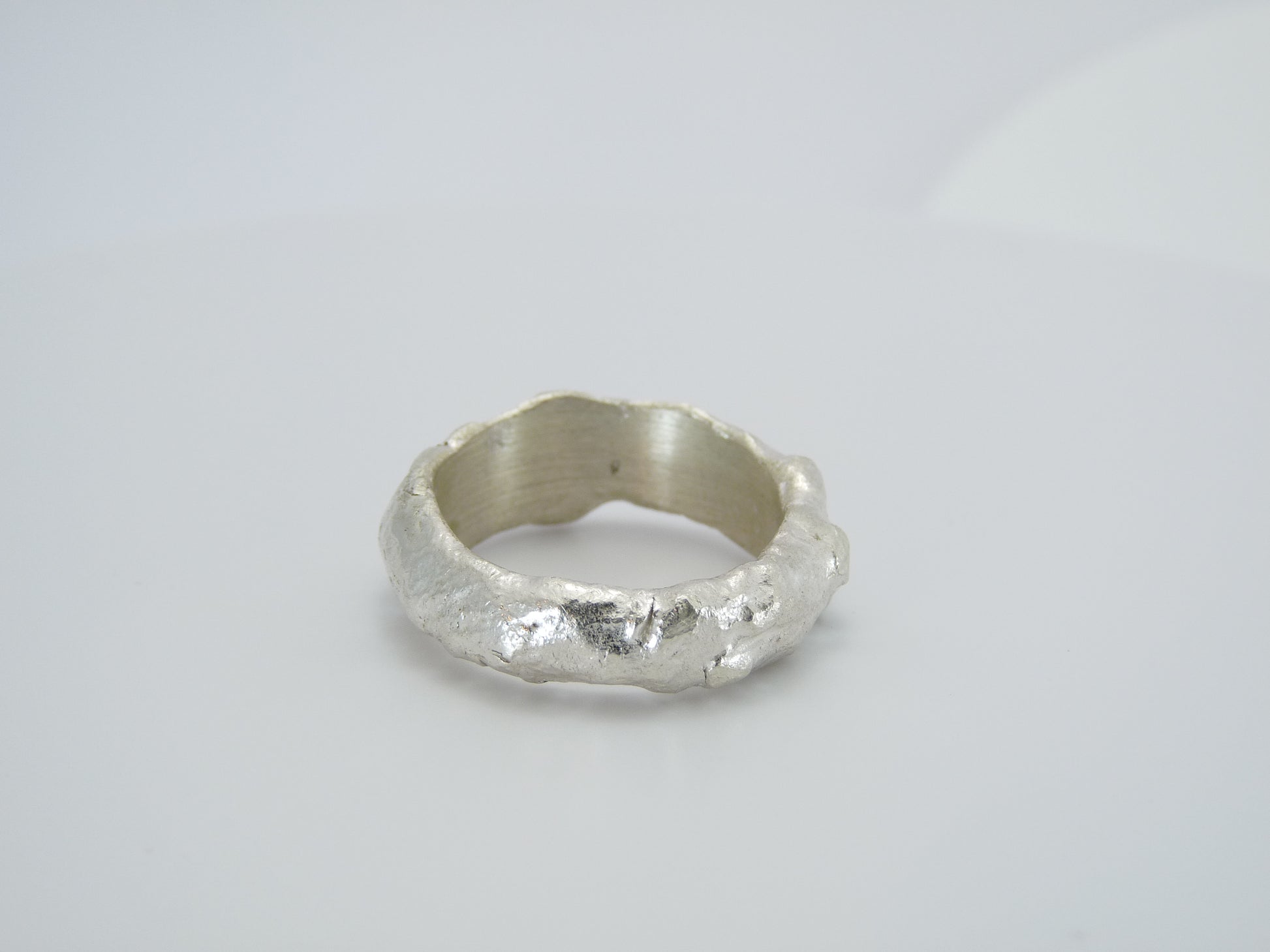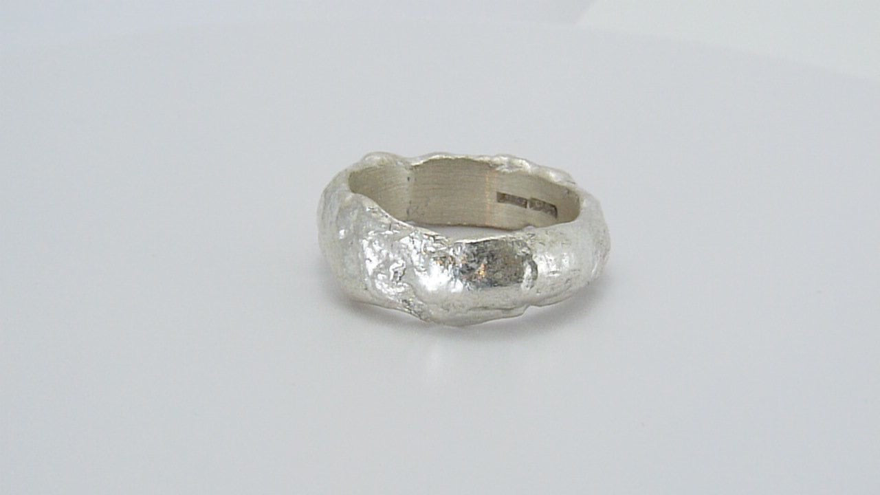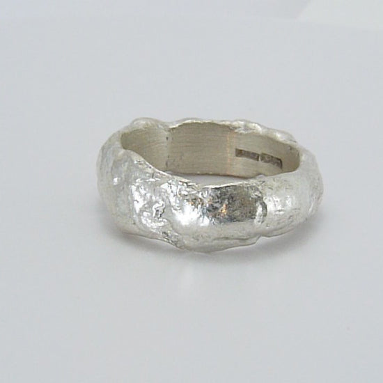 A solid sterling silver ring, hand forged allowing the molten silver to flow into the textures of volcanic lava like rock